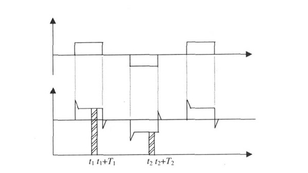 污水管道流量計一般都采用工頻交流電源供電, 其電源電壓的幅值和頻率的變化都會給污水管道流量計帶來電源性干擾噪聲。對電源電壓的幅值變化, 因采用多級集成穩壓, 一般而言電源電壓的幅值變化對電磁流量的測量精度影響不大。當電源電壓的頻率波動時, 雖然其波動范圍有限, 但對污水管道流量計測量精度影響較大。為了解決工頻干擾問題, 實現對流體流速感應電勢eab信號的準確測量, 需利用以下基本關系:①勵磁周期為工頻周期的整數倍, 即勵磁頻率為50/nHz(n為偶數);②正負勵磁下的同相位采樣。圖2是對應低頻矩形波勵磁形式下的典型電勢信號形式, 按上述關系在一個勵磁周期下, 若假設t1 和t2 點為工頻干擾的等效干擾點, 且采樣寬度T=T1 =T2 , 則eab的基本算式為: