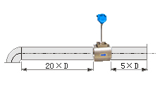 若傳感器安裝點(diǎn)的上游有90°彎并沒有或T形接頭,傳感器上游應(yīng)有不小于20D的等徑直管段,下游應(yīng)有不小于5D的等徑直管段。
